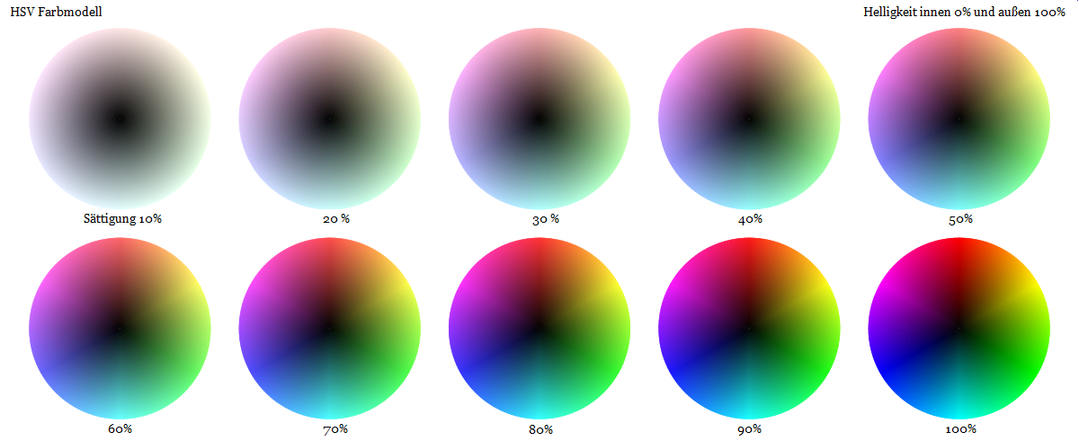 Bei den 10 abgebildeten Farbkreisen steigt die Sättigung von 10% jeweils um 10% bis 100%,