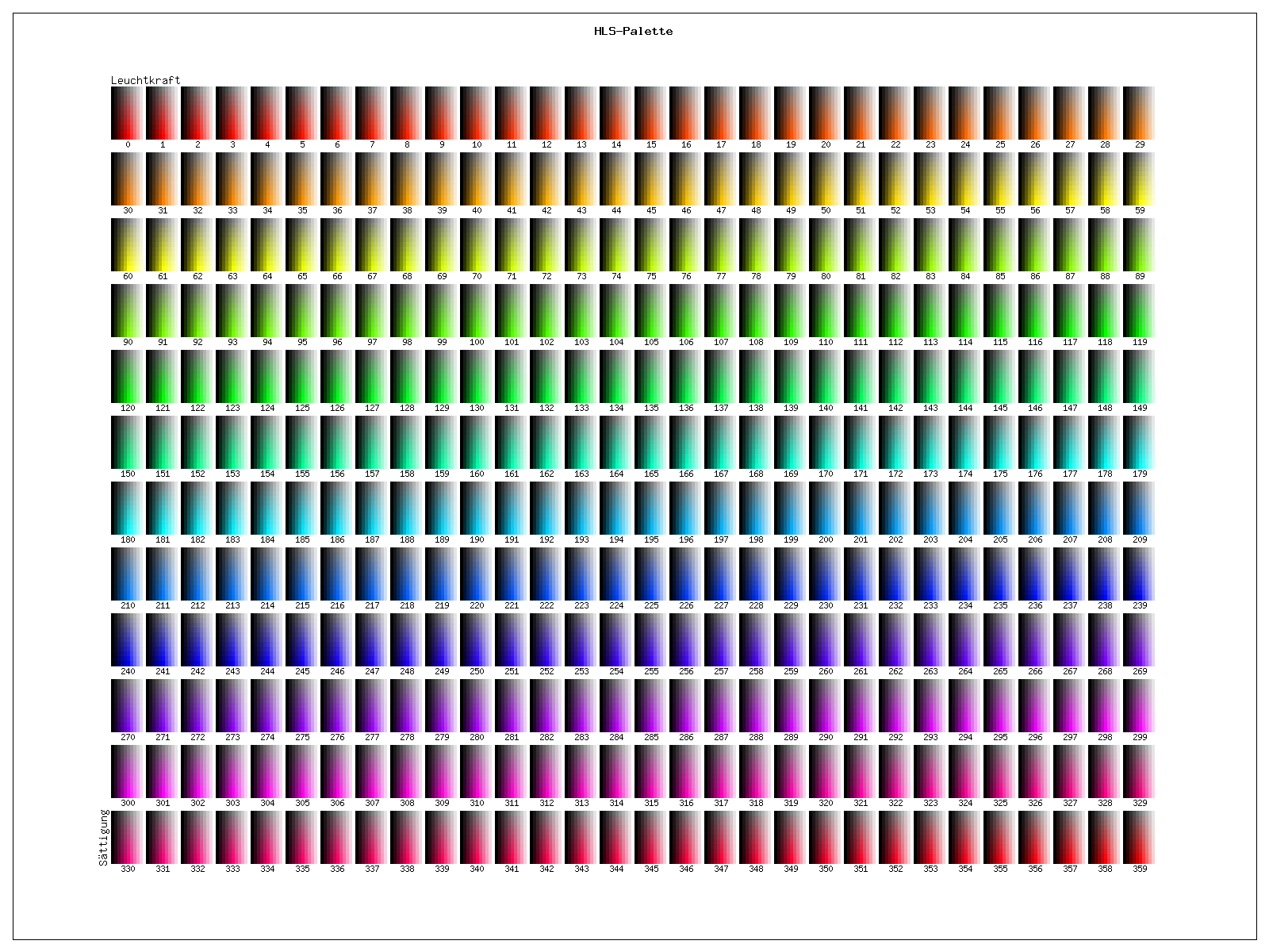 Es sind 360 Teilpaletten für jede Farbe in 10 Zeilen zu 20 Spalten abgebildet.