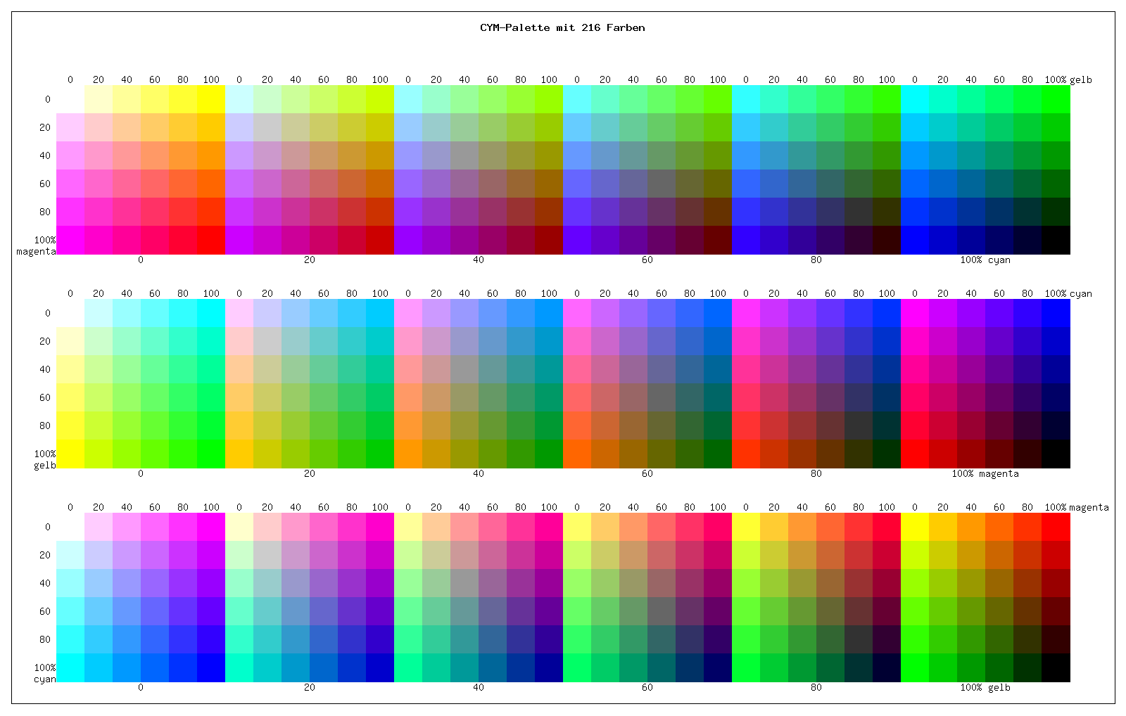 216 Farben sind in 20%-Schritten in 6 Teilpaletten mit 6 Zeilen und 6 Spalten abgebildet.